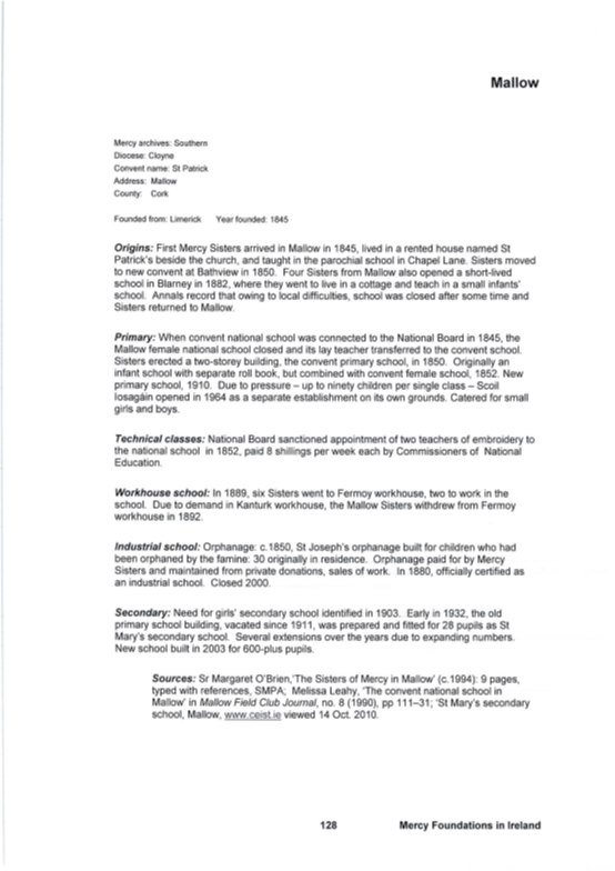 Annals of the Convent of Mercy, Limerick. A history of Mallow by Evelyn Bolster.
