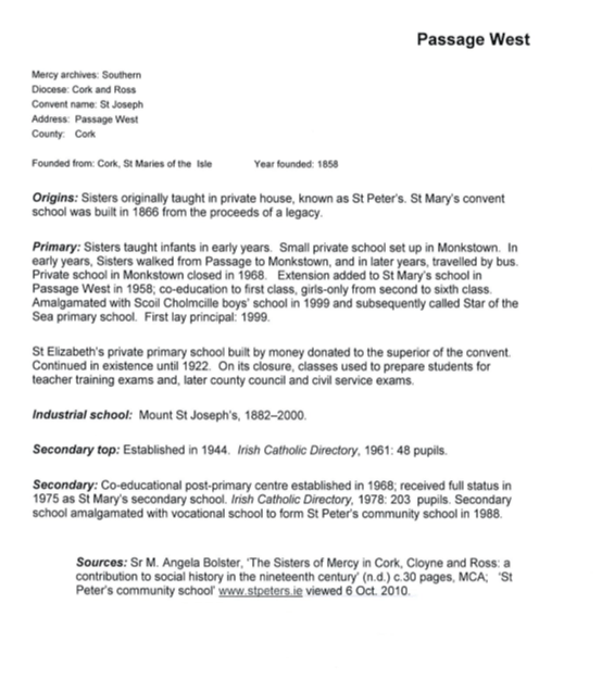 The school was built in 1866. An extension was added in 1958. It was co-ed up to and including First Class. After receiving First Holy Communion the boys transferred to the local Boys’ School. The convent school amalgamated with Scoil Cholmcille in 1999 under the name of Star of the Sea Primary School. The Sister of Mercy who was Principal at that time resigned her post. She was the last Sister of Mercy to work in the school. The name Star of the Sea was chosen to honour Our Lady and in recognition of the involvement of the Mercy Order in Passage West and to reflect the maritime location.