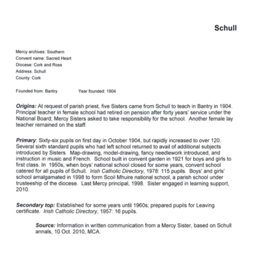 Another Sister of Mercy was chaplain there for a few years in the mid-1990s. A Sister was also Learning Resource Support Teacher in the 2000s in Scoil Mhuire N.S., Schull which was the base school and also in Goleen and Lissagriffin Primary Schools and in Ballydehob for a shorter period.